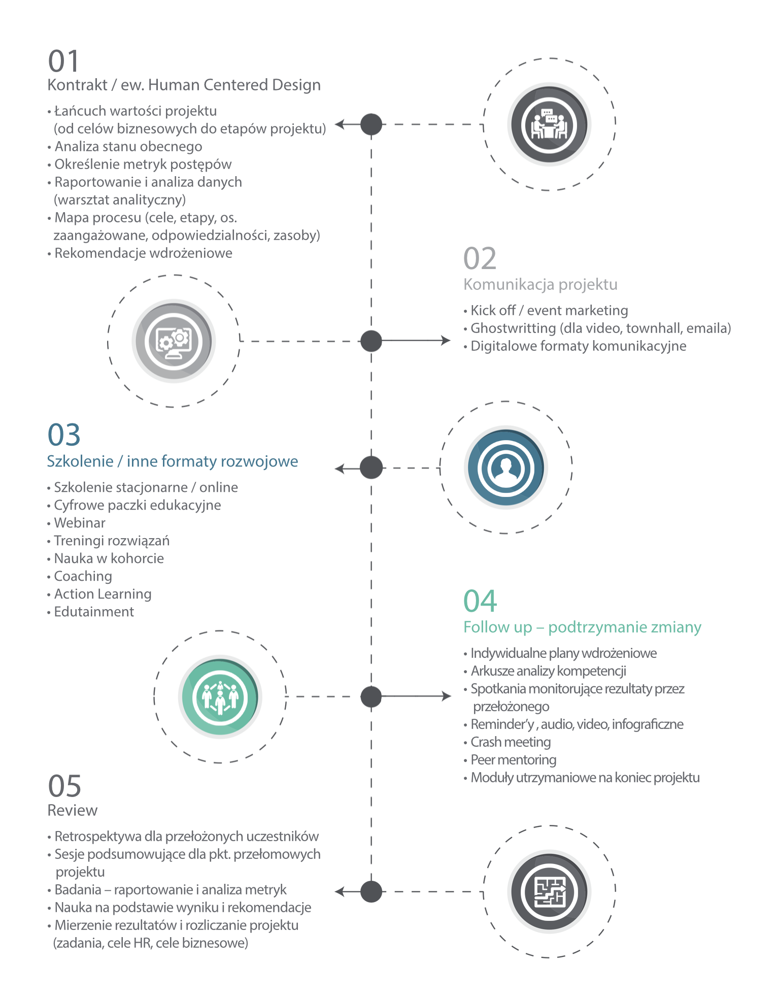Proces, a nie projekt – zgodnie z krzywą zmiany Virgini Safir bezpośrednio po wdrożeniu zmiany (np. poprzez działania rozwojowe) pojawia się ryzyko porzucenia tejże. Systemowe działania wspierające (digital learning, peer mentoring, zaangażowanie przełożonych, przypisanie odpowiedzialności) pozwalają te ryzyko zminimalizować oraz uzyskać zmianę na poziomie nowych zachowań oraz wyników finansowych.