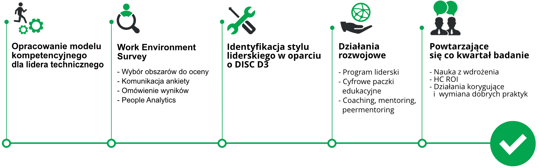 Program rozpoczyna się od opracowania modelu kompetencyjnego dla lidera technicznego. Następnie, prowadzone są sesje Development Center (DC) dla wybranej grupy pracowników, co pozwala na pomiar kompetencji liderskich na początku programu. Kolejnym etapem jest identyfikacja stylu liderskiego każdego uczestnika za pomocą narzędzia Gdy liderzy są już odpowiednio zrozumiani i zdiagnozowani, następuje etap szkoleń liderskich. Te specjalistyczne sesje mają na celu rozwój niezbędnych umiejętności i wiedzy, które pomogą liderom osiągnąć sukces w ich nowych rolach. Program oferuje wsparcie poprzez coaching i mentoring indywidualny. Na końcu znów sesje DC pozwalające na pomiar postępów.