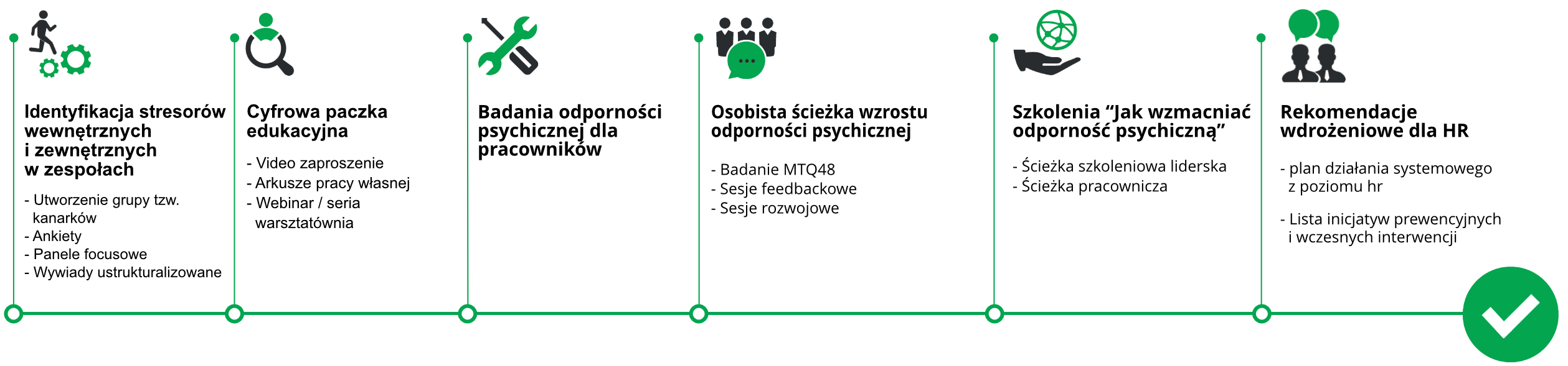 Osoby tzw. wrażliwe psychicznie mogą poprzez sesje rozwojowe (trening, coaching, mentoring, sesja feedback’owa) wzmacniać swoją odporność psychiczną w takich obszarach jak : podejście do wyzwań, zaangażowanie, kontrolę, pewność siebie i poczucie /potrzeba wpływu oraz kontrola emocji. Dzięki badaniu za pomocą kwestionariusza MTQ48 i MTQ48 plus uczestnik zbada swoją odporność psychiczną. Następnie, w zależności od potrzeb, otrzyma przygotowaną dla niego osobistą ścieżkę odporności psychicznej.