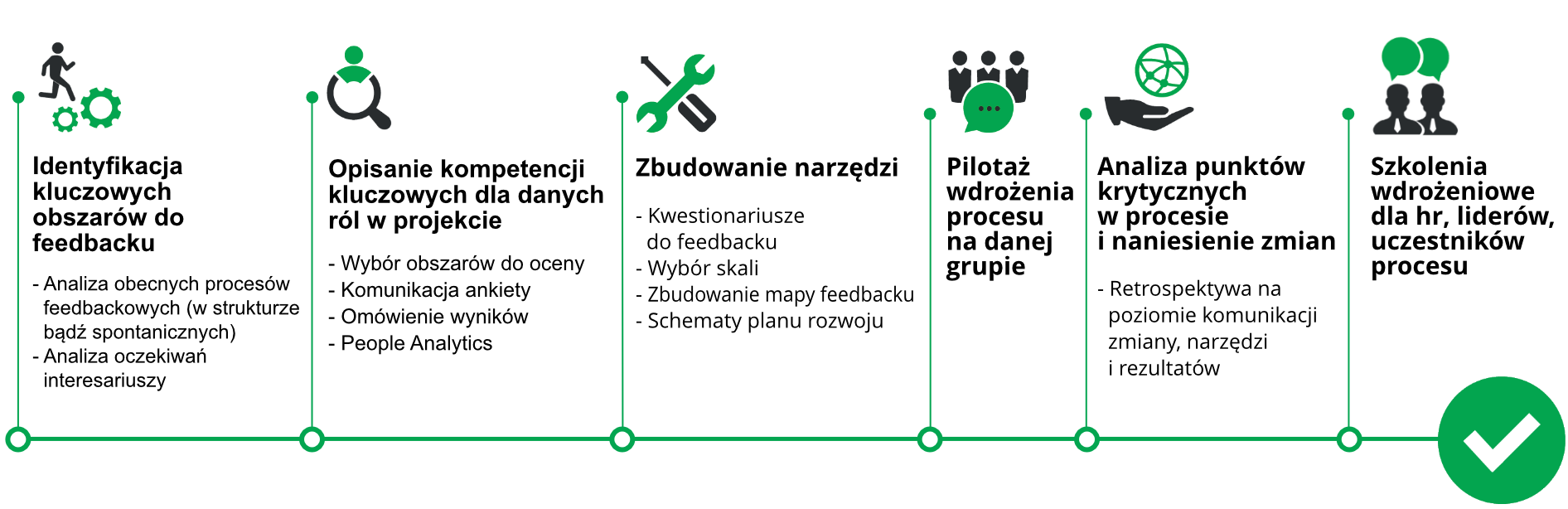 Opracowanie i wdrożeniu procesu feedbacku opartego na kompetencjach w modelu agile – projekt i wdrożenie modelu feedbacku w oparciu o kompetencje miękkie, techniczne / specjalistyczne i liderskie. Program wdrożeniowy zakłada zaprojektowanie modelu, feedbacku, grup oceniających, dobór skal, opracowanie formularzy ewaluacyjnych oraz szkolenia wdrożeniowe dla wszystkich odbiorców.