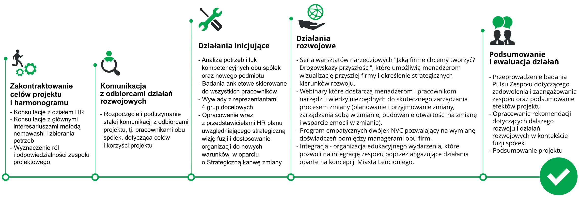 To szereg narzędzi, z których szkolenia to tylko jedno z wielu rozwiązań, które prowadzą do oczekiwanych rezultatów. Dążąc do mierzalnych wyników zwracamy uwagę na identyfikację i odpowiedź na oczekiwania interesariuszy projektu, wykorzystując przy tym bogactwo formatów zmian – zarówno synchronicznych, jak i asynchronicznych.