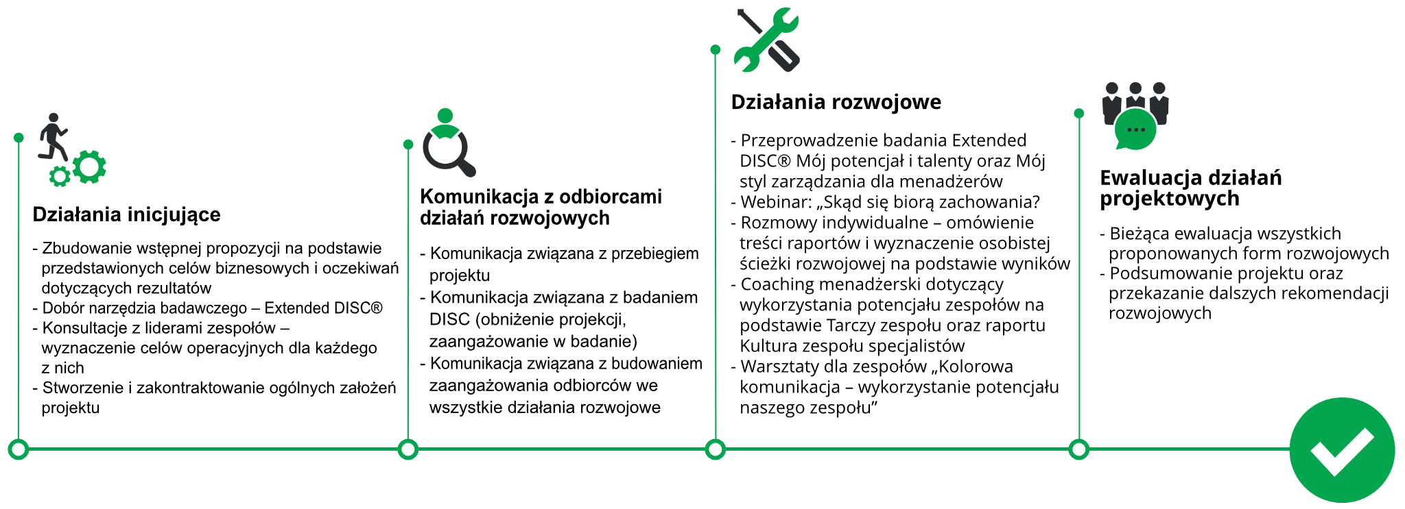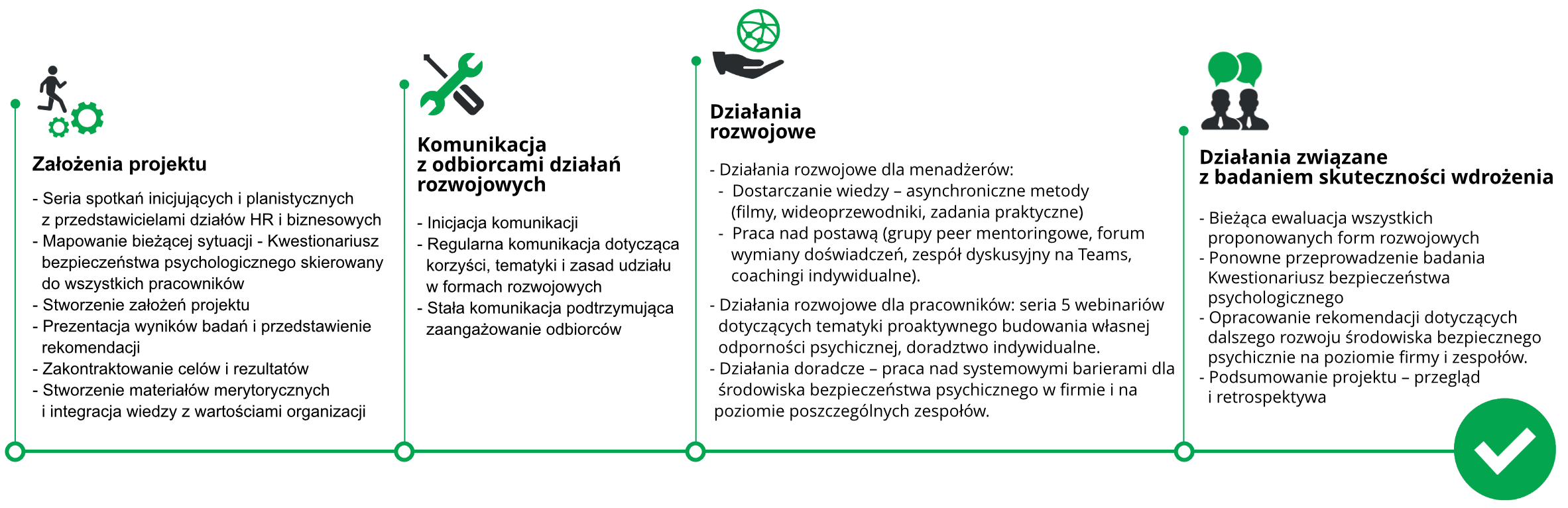 Zagregowane wyniki badania są podstawą do zaprojektowania pracy grup fokusowych, które pozwolą osadzić wynik badań jakościowych w kontekście konkretnej organizacji. Na podstawie wyników, wspólnie z Partnerem, planujemy i wdrażamy różnego rodzaju formaty rozwojowe – w tym szkolenie „Jak kontraktować bezpieczeństwo psychiczne w relacji szef – pracownik?” lub „Bezpieczeństwo psychiczne w efektywnym zespole”. Kolejnym etapem projektu jest wypracowanie i wdrożenie inicjatyw przekazujących odpowiedzialność za bezpieczeństwo psychiczne do zespołu. Podsumowaniem działań jest wskazanie zwrotu inwestycji w kapitał ludzki (HC ROI), z wykorzystaniem People Analytics.