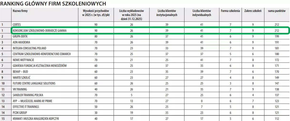 Z dumą informujemy, że najlepszą firmą szkoleniową w 2026 roku okazała się Gamma – ex aequo z firmą Certes. W tym rankingu pozycję lidera zajmujemy nieprzerwanie od 2024 roku. Współzałożyciel i dyrektor ds. rozwoju Gammy Michał Wasilewski, tak skomentował ten sukces:
