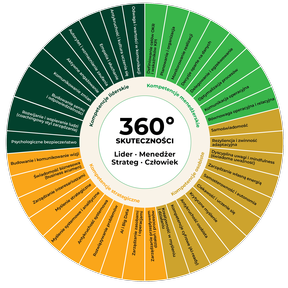 Model 360° skuteczności to 37 kluczowych kompetencji, podzielonych na te liderskie, strategiczne, menedżerskie i osobiste. Pozwala to spojrzeć na nie jak na całość, ale też łatwiej odnaleźć zależności pomiędzy nimi i zagłębić się w interesujący nas wycinek.