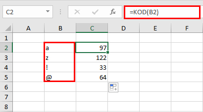 Funkcja KOD zwraca wartość kodu liczbowego pierwszego znaku w ciągu tekstowym. Zwracany jest kod stosowny do zestawu znaków używanego na komputerze.