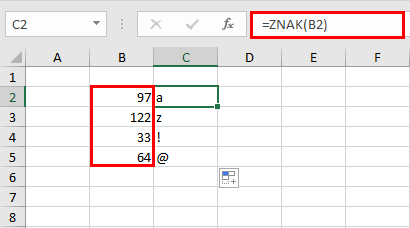 Funkcja ZNAK programu Excel zwraca znak po podaniu poprawnego kodu liczbowego.