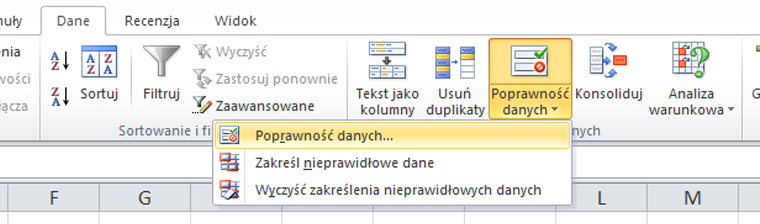 Następnie wybierz zakładkę „Dane” i wybierz opcję „Poprawność danych„.