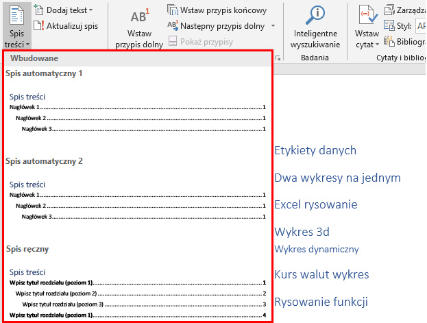 Najprostszym sposobem na stworzenie automatycznego spisu treści jest użycie w tekście nagłówków za pomocą funkcji Style.
