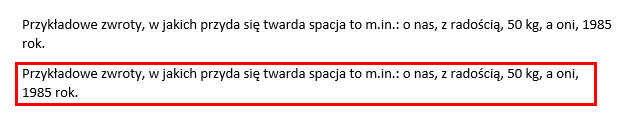 Przykładowe zwroty, w jakich przyda się twarda spacja to m.in.: o nas, z radością, 50 kg, a oni, 1985 rok.