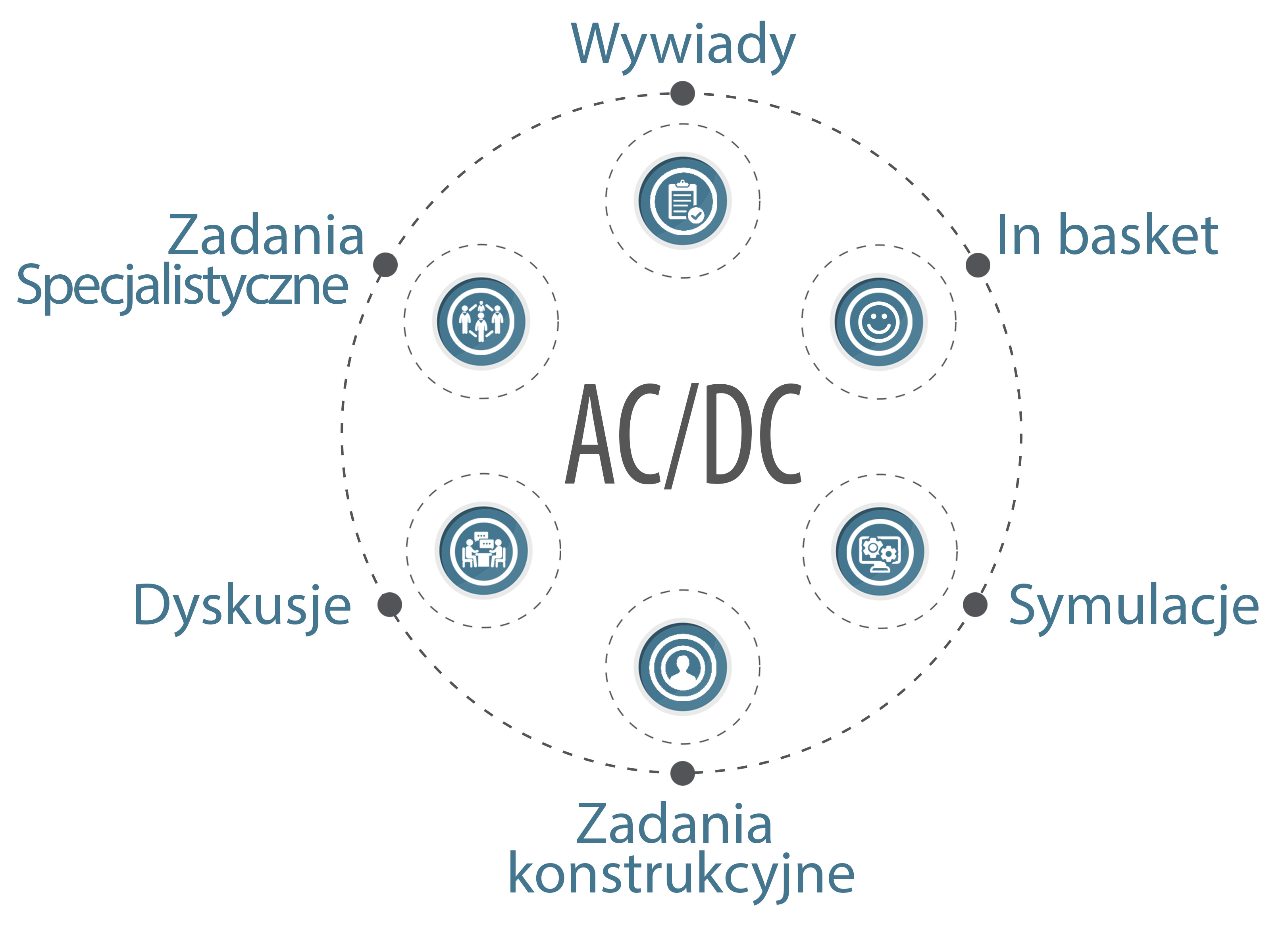 Celem zadań proponowanych w ramach AC/DC jest umożliwienie uczestnikom sesji „wykazania się” odpowiednim poziomem kompetencji. Zadania powinny być konstruowane w taki sposób, aby prowokować wystąpienie interesujących nas wskaźników behawioralnych.