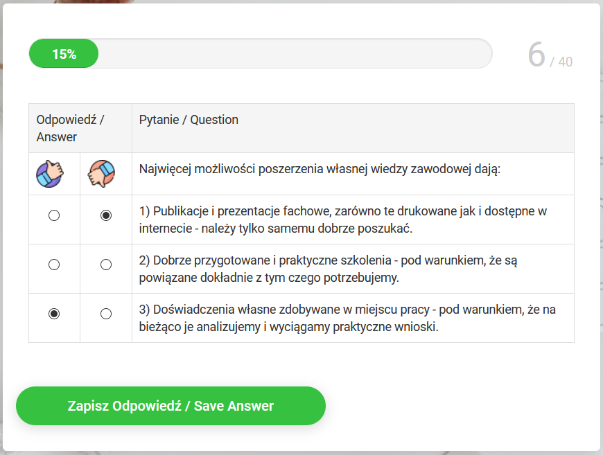 Daje to możliwość odniesienia pytań do poszczególnych obszarów zachowań związanych z daną kompetencją. Jest to zdecydowanie najlepsze rozwiązanie. Otrzymujemy wówczas gwarancję, że test jest spójny z innymi narzędziami oceny oraz że odpowiada znaczeniu danej kompetencji. Oznacza to również, że w przypadku badania 8 kompetencji cały test składa się z zestawu około 40 pytań.