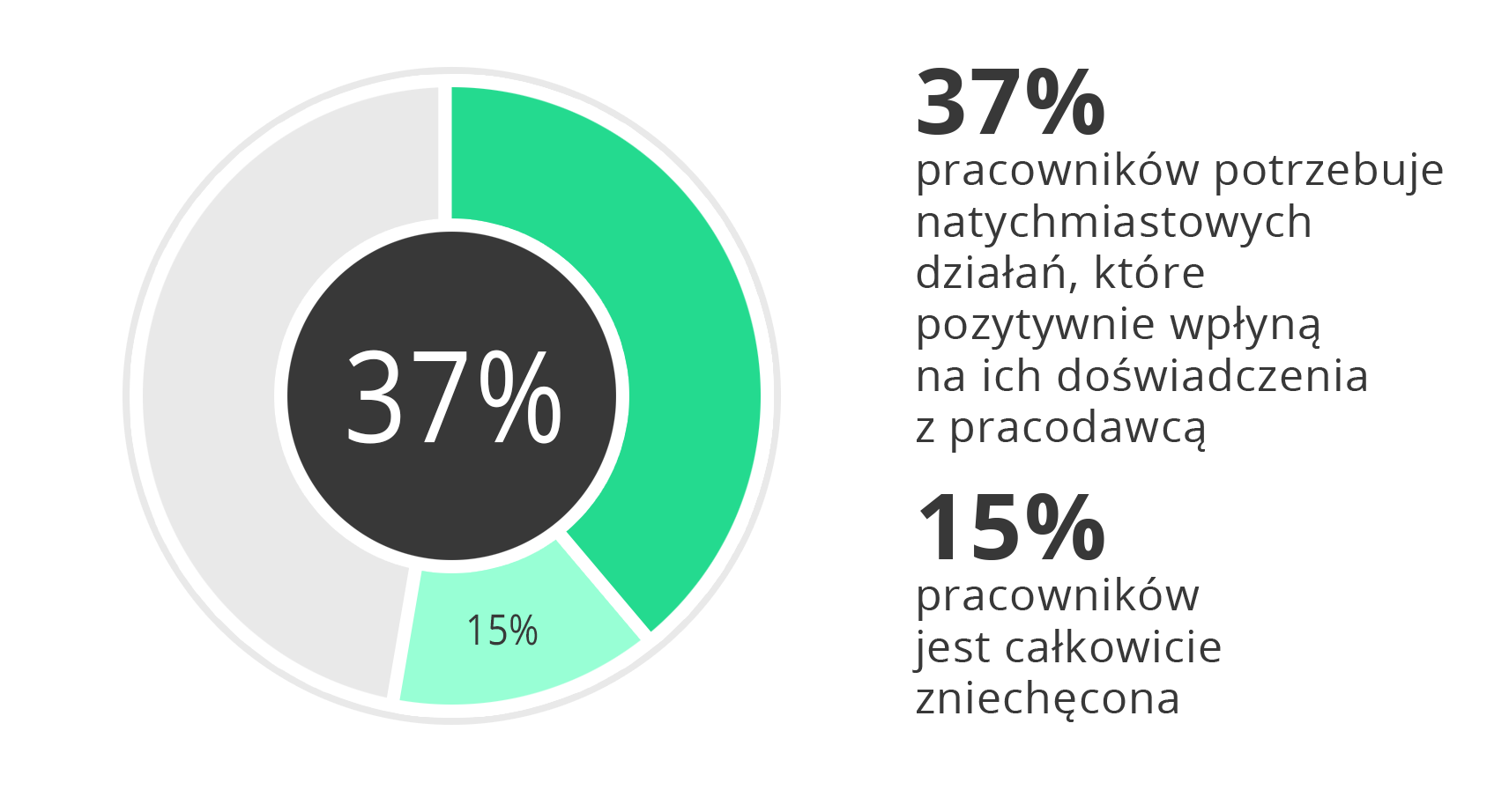 Podobnie według badań firmy Aon Hewitt jest dużo do zrobienia w obszarze zaangażowania pracowników. Wskazuje, że 37% pracowników jest zupełnie niezaangażowana, a 15% całkowicie zniechęcona.