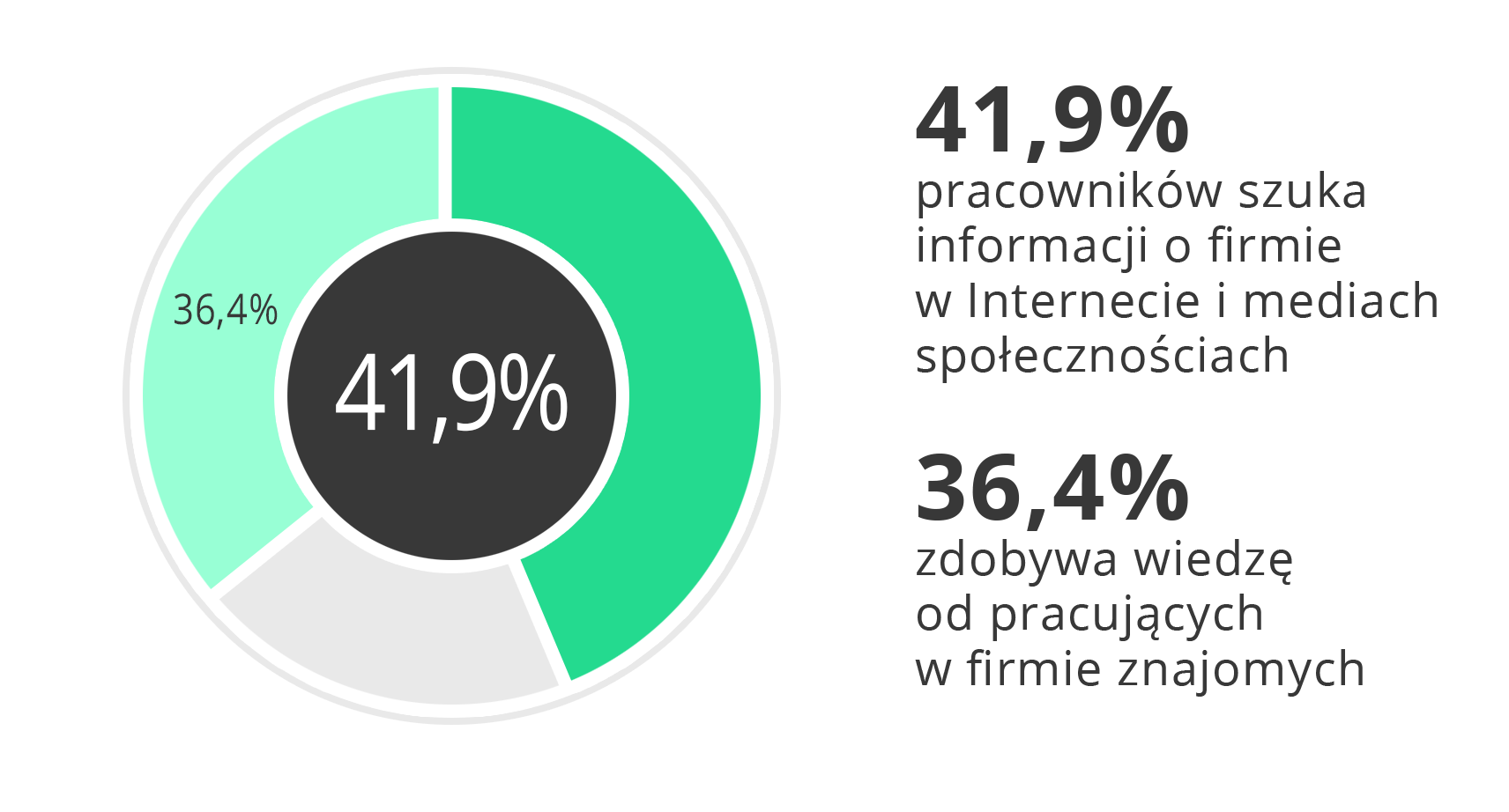 41,9% pracowników szuka informacji o firmie w Internecie i mediach społecznościach, do tego 36,4% zdobywa wiedzę od pracujących w firmie znajomych. Oznacza to, że warto zadbać o wizerunek firmy online oraz dowiedzieć się, co mówią o niej sami pracownicy.