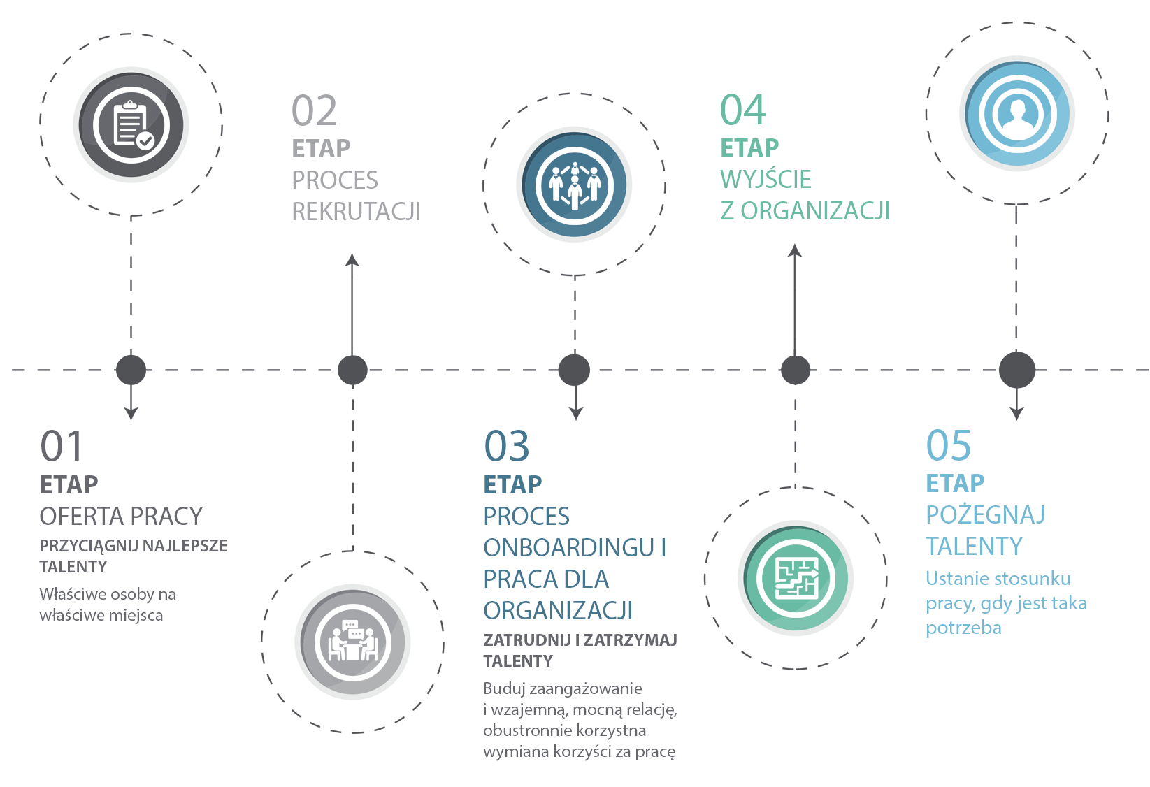 Od początku i do końca. Atrakcyjną markę i pozytywne doświadczenie buduje się od momentu pierwszej styczności potencjalnego kandydata z naszą ofertą pracy, poprzez działania wewnątrz firmy, gdy dana osoba już jest naszym pracownikiem, aż do czasu, gdy ktoś przestaje dla nas pracować. Musimy zatem od razu zaplanować drogę naszego pracownika od samego początku, aż do momentu, gdy stanie się naszym „absolwentem”.