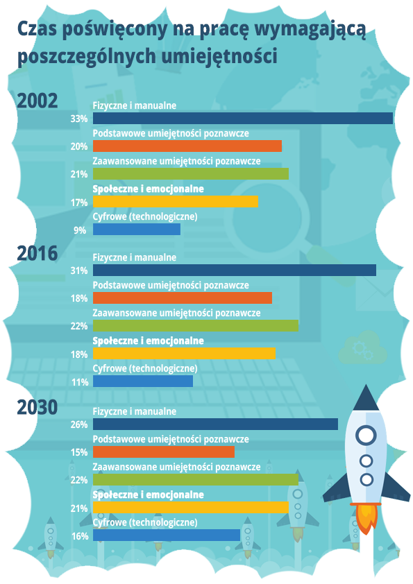 Wynika z nich, że coraz mniej czasu poświęca się na pracę fizyczną i wymagającą zdolności manualnych, rośnie zaś rola tzw. zaawansowanych umiejętności poznawczych – jak kodowanie i programowanie, ale także postrzeganych do niedawna jako “miękkie” (i dodatkowe) kompetencji, jak kreatywność, przyswajanie złożonych informacji oraz rozwiązywanie problemów.