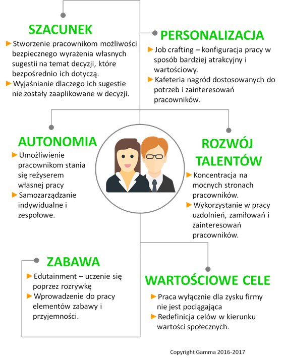 Firma szkoleniowa Gamma dokonała przeglądu i analiz badań dotyczących motywującego środowiska pracy (źródła danych: Gallup, Work Service, Millward Brown, Deloitte, badania własne). Na podstawie tych badań stworzyliśmy syntetyczną mapę preferencji i oczekiwań młodych profesjonalistów wobec swojego miejsca pracy.